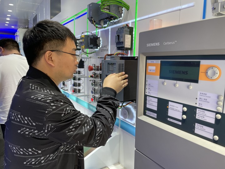 一輛集裝箱大卡車別出心裁地裝飾成移動的“會展中心”,印有西門子標志的旗幟迎風飄揚,車身“共創智能基礎設施新生態”幾個大字格外醒目。